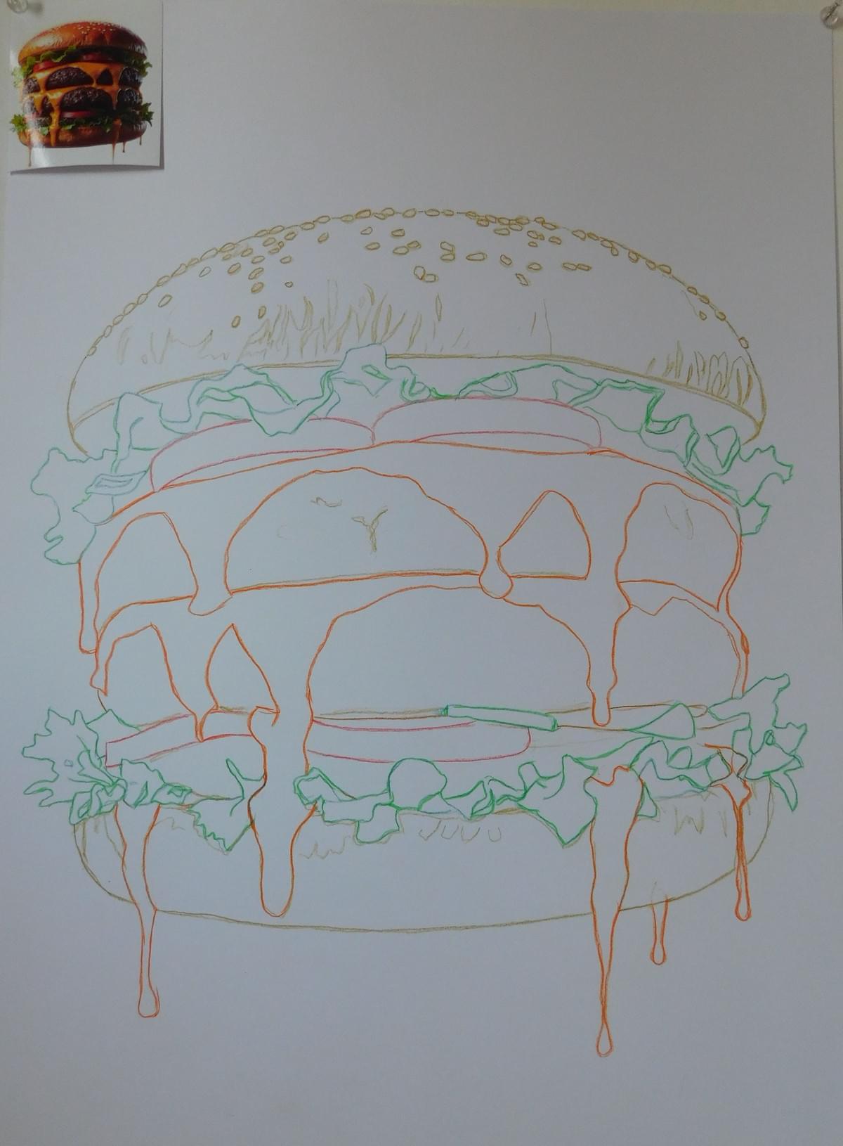 Im zweiten Arbeitsschritt passiert nichts Besonderes. Ich mache eine Art Reinzeichnung, wo ich die einzelnen Abschnitte für mich besser definiere. Darauf basierend entscheide ich, welchen Teil ich zuerst ausarbeite. In diesem Fall werde ich mit den Brötchen (oben wie unten) beginnen.